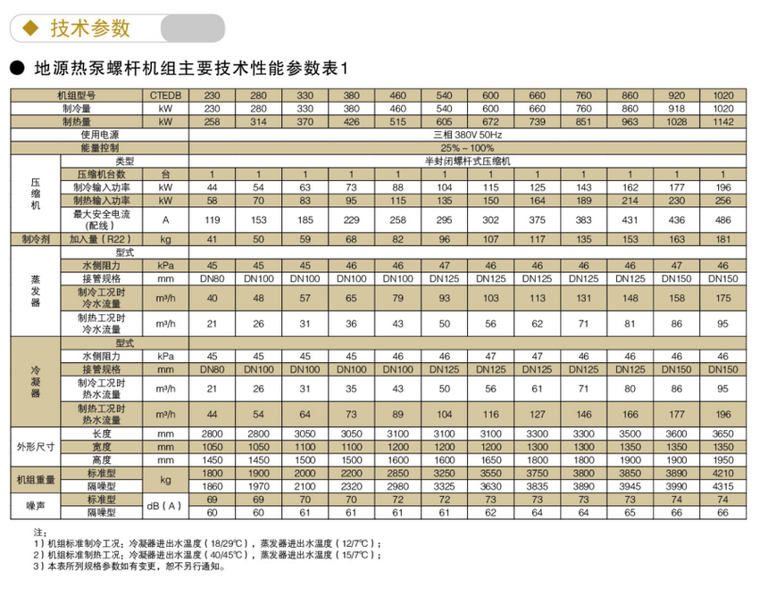 二、产品特点 选件精良:采用品牌压缩机(汉钟/复盛),双螺杆机组结构,旋转不平 衡力极小,引起的振动及噪音极低;部分负荷运转平衡,效率高。·优化设计:“大温差,小流量”的技术思路,为用户大限度节省宝贵的水资源,同时也降低了机组的运行费用, 自主研发:机组蒸发器铜管为内螺纹式铜管,冷凝管为外翅片铜管,使换热系数和换热能力大幅度提高。 节能环保:机组节流元件采用电子膨胀阀,可以精确的控制制冷剂的流量,确保制冷系统具有良好的性能水平。 控制先进:电脑控制和多重保护,使整机安全运行;并带有RS-485接口,开放Modbus协议,可实现楼宇自动化集中控制。 用电安全:电控箱内配电盘强弱电分离,采用独立供电方式,实现电源供电隔离,抗干扰性强。 机组结构紧凑,占地面积小,节省机房空间。 机组增设的PLC远程监控系统,用户可利用计算机或手机对远端的机组进行监控与管理 主机在出厂时已完成管路组装和电器控制系统,以及在测试台测试运行,现场只需要连接电源、冷却水和冷冻水,即可投入使用。适用范围:螺杆机组运行水源温度范围宽:10~35℃;②既可提供7℃或50℃空调冷热水,也可提供生活热水;③也可作为城市区域集中供暖的热源使用。 四、选型推荐 制冷量范围(单台):100-2200KW 香用面积(单台):中央空调1000-25000㎡7;地板采暖1000-45000㎡中央空调制冷和制热、地板采暖制热、制取大量生活、洗浴热水等6、应用范围 螺杆式地源热泵广泛应用于办公楼、商场、宾馆医院、学校、影剧院、体育馆场、娱乐中心、工矿企业等大中型建筑提供中央空调系统用冷冻水热水,也可为纺织、化工、食品、电子、科研等行业提供工艺用冷冻水热水。